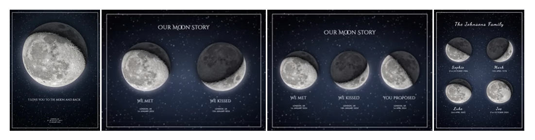 Begin your custom design by selecting the timeline you wish to commemorate. You have the flexibility to focus on a single meaningful date, such as a birthday, transforming it into a precise moon phase or star map of that specific night. If you wish to capture a journey or a group, you can expand your design to include between two and four distinct dates. This allows you to combine relationship milestones—like a first meeting and a wedding day—or unite family members by displaying their individual celestial events side-by-side in one cohesive layout.